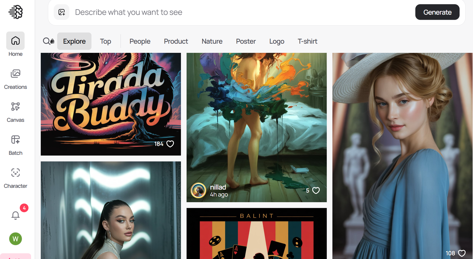 - Krea AI:即時生圖,拖曳調整。支援real time 調整。