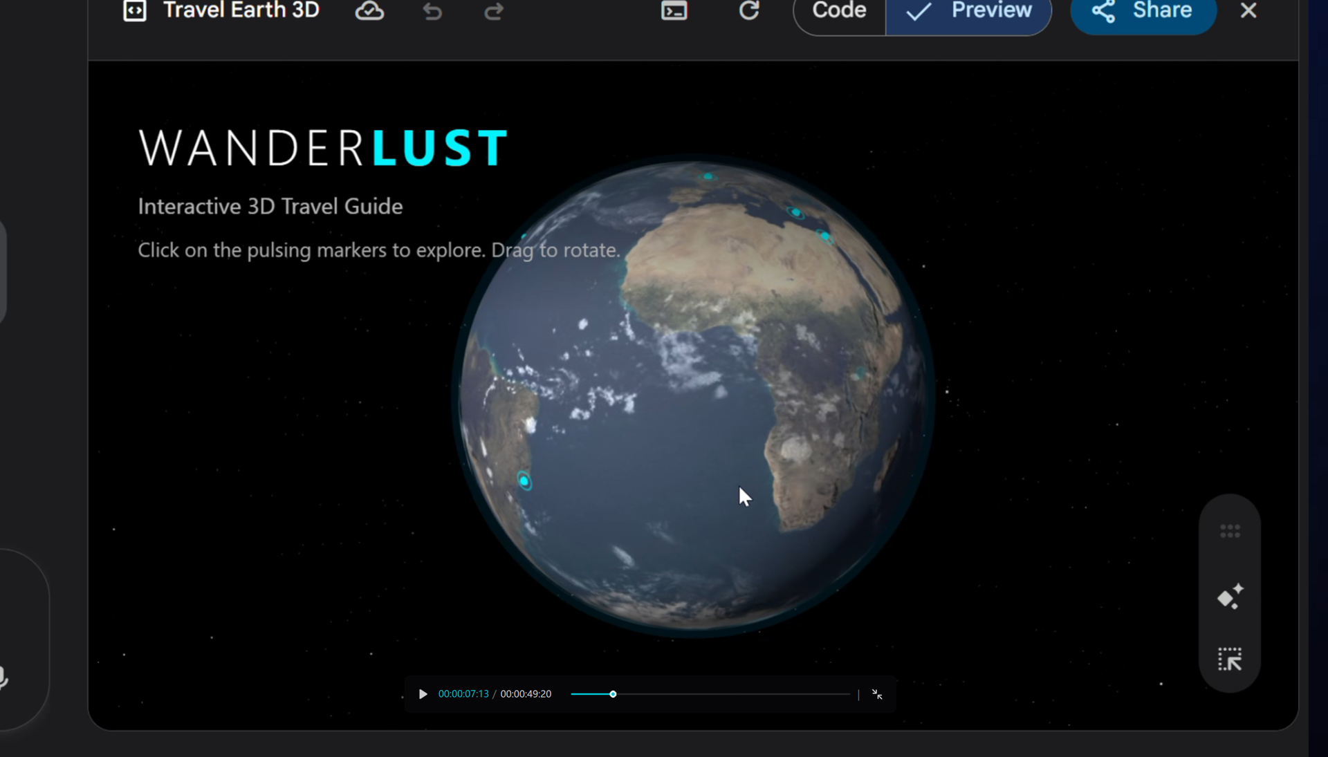Prompt: 「幫我寫一個 3D 地球旅遊頁面。畫面中間要有一個自轉的地球,背景係星空。當我滑鼠 Click 地球上面任何一點,你要彈出一個 Info Card,顯示嗰個地方嘅旅遊景點同美食推介。用 HTML 同 JS 寫,我要 Copy 就用到。」