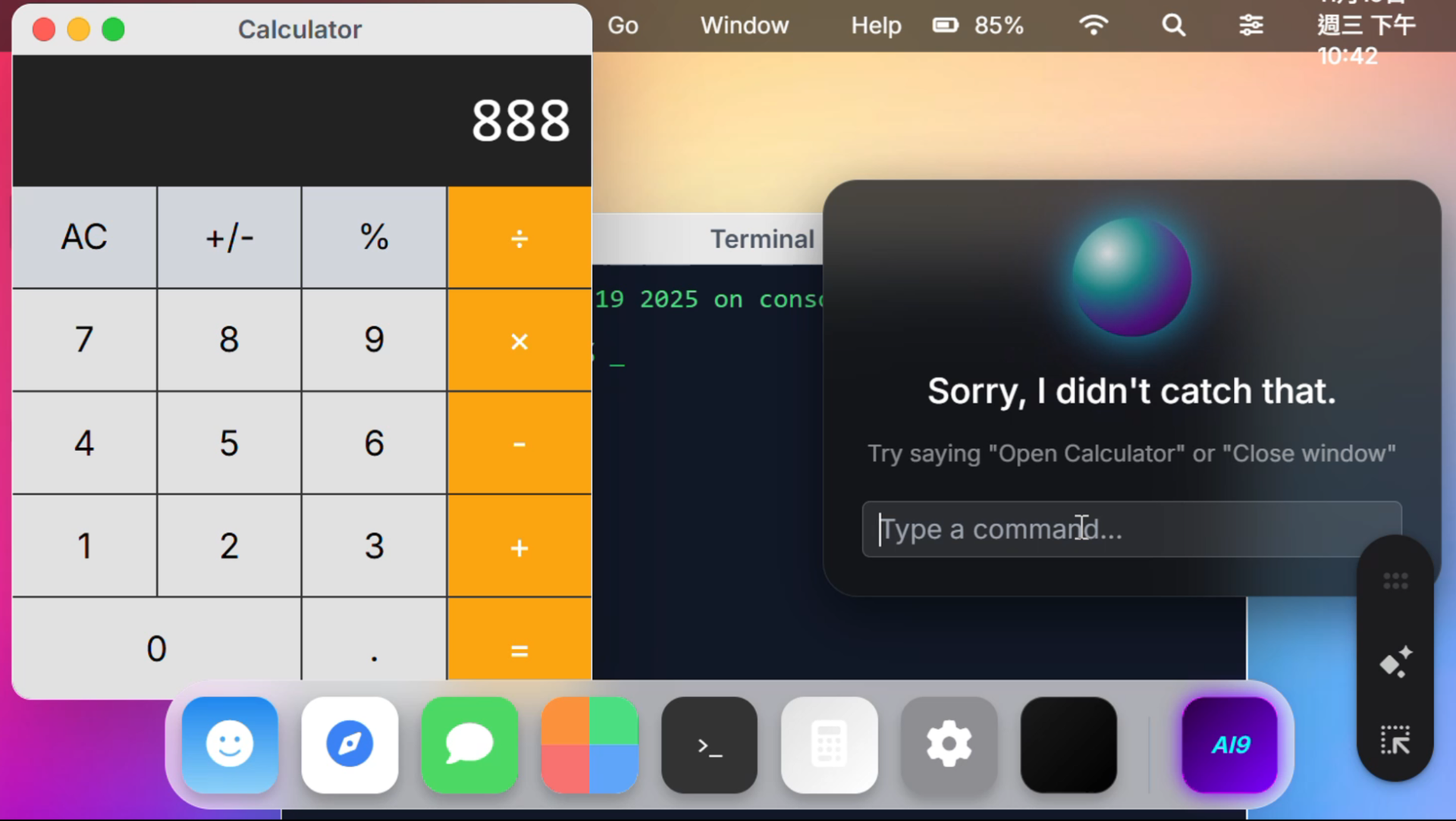 - 最後,幫我加埋個 "Siri" 功能,我要可以直接打字或禁制叫 Siri 控制呢個 OS,例如叫佢 "打開計數機"。」