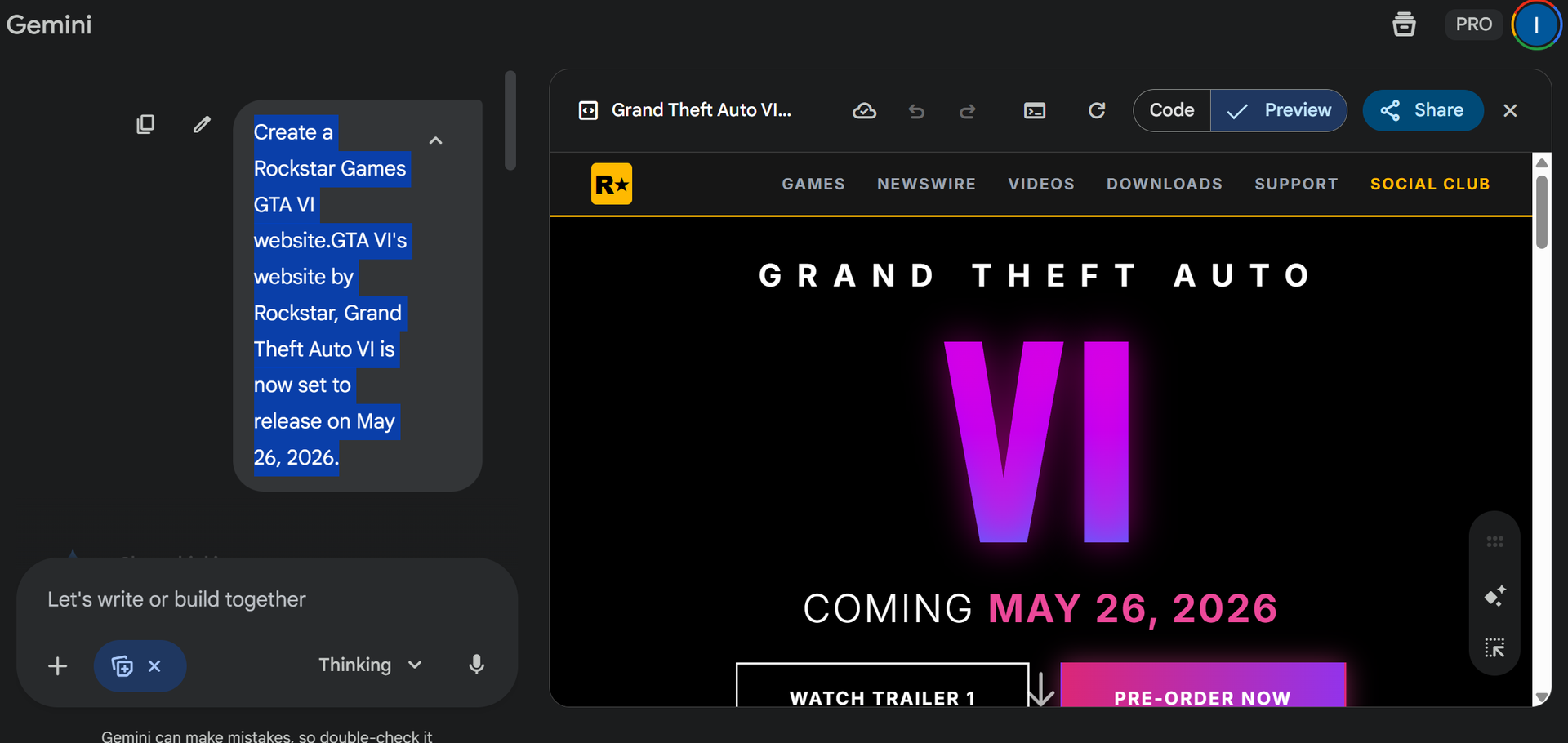 按下 Enter 後,大約過了 5 秒鐘,Gemini 3.0 直接生成了一個完整的預覽視窗,而不僅僅是冷冰冰的代碼。