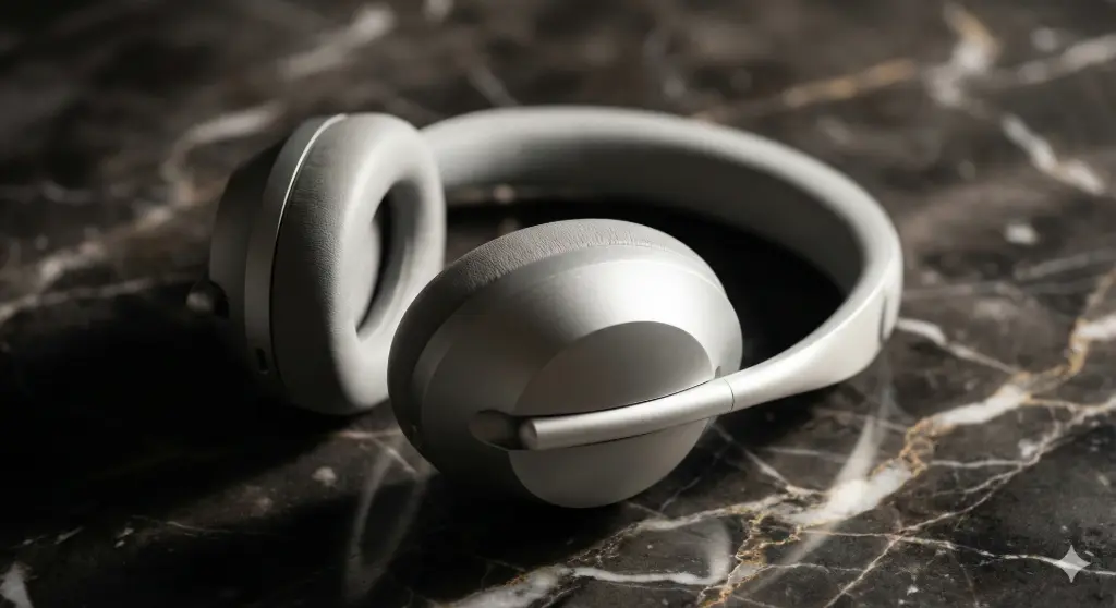 - Prompt 靈感: Professional product photography of a sleek silver headphone, placed on a dark marble surface, dramatic side lighting, soft shadows, shallow depth of field, 85mm lens.