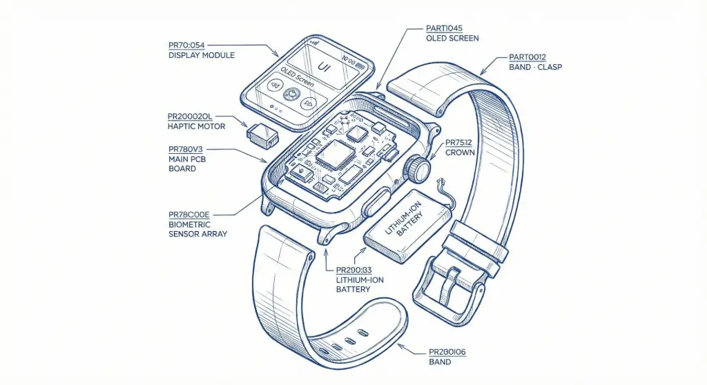 - Prompt 靈感: A technical exploded view diagram of a smartwatch, components floating apart neatly, clean white background, technical lines, blueprint style.