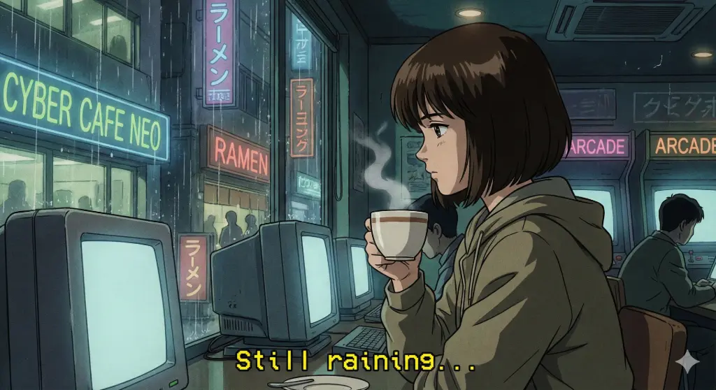 - Prompt 靈感: 1990s anime screenshot, a girl drinking coffee in a rainy Tokyo cyber cafe, lo-fi aesthetic, film grain, muted colors, subtitles at the bottom saying "Still raining...".