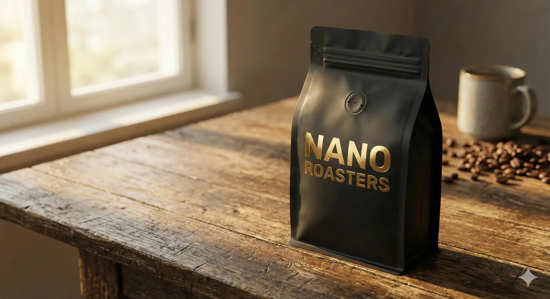 - Prompt 靈感: A matte black stand-up pouch for coffee beans on a rustic wooden table, gold foil text "NANO ROASTERS" embossed on the front, warm morning light.