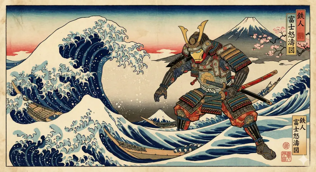 - Prompt 靈感: Iron Man suit rendered in traditional Japanese Ukiyo-e woodblock print style, crashing waves, Mount Fuji in the background, textured paper.