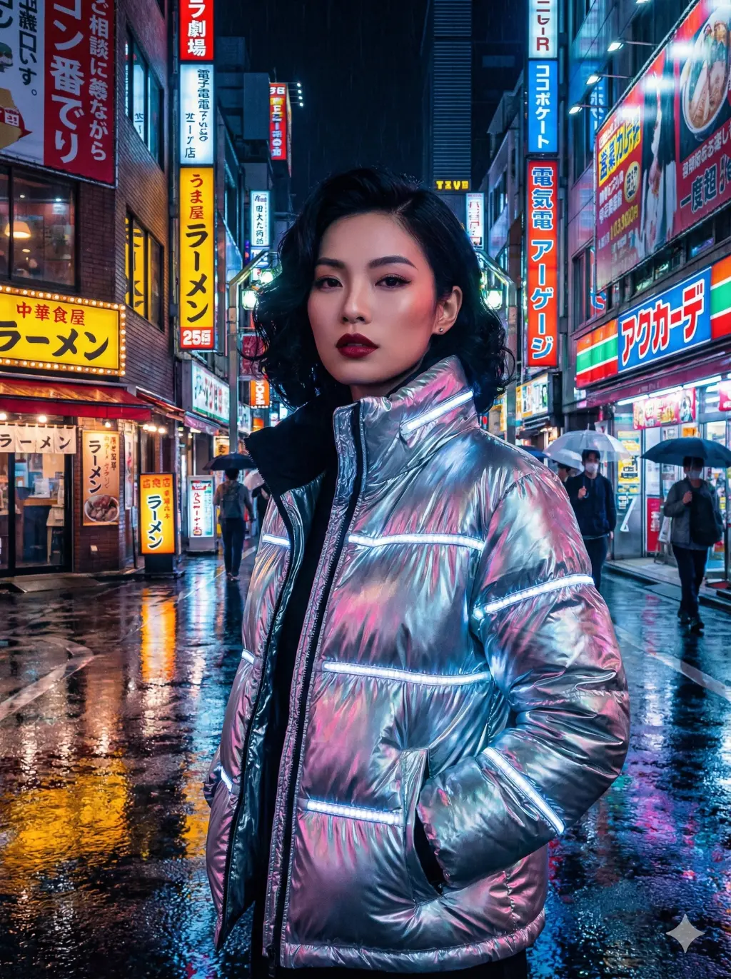 - Prompt 靈感: [參考圖] The same female model wearing a futuristic silver puffer jacket, standing on a Tokyo street at night, neon lights reflection.
