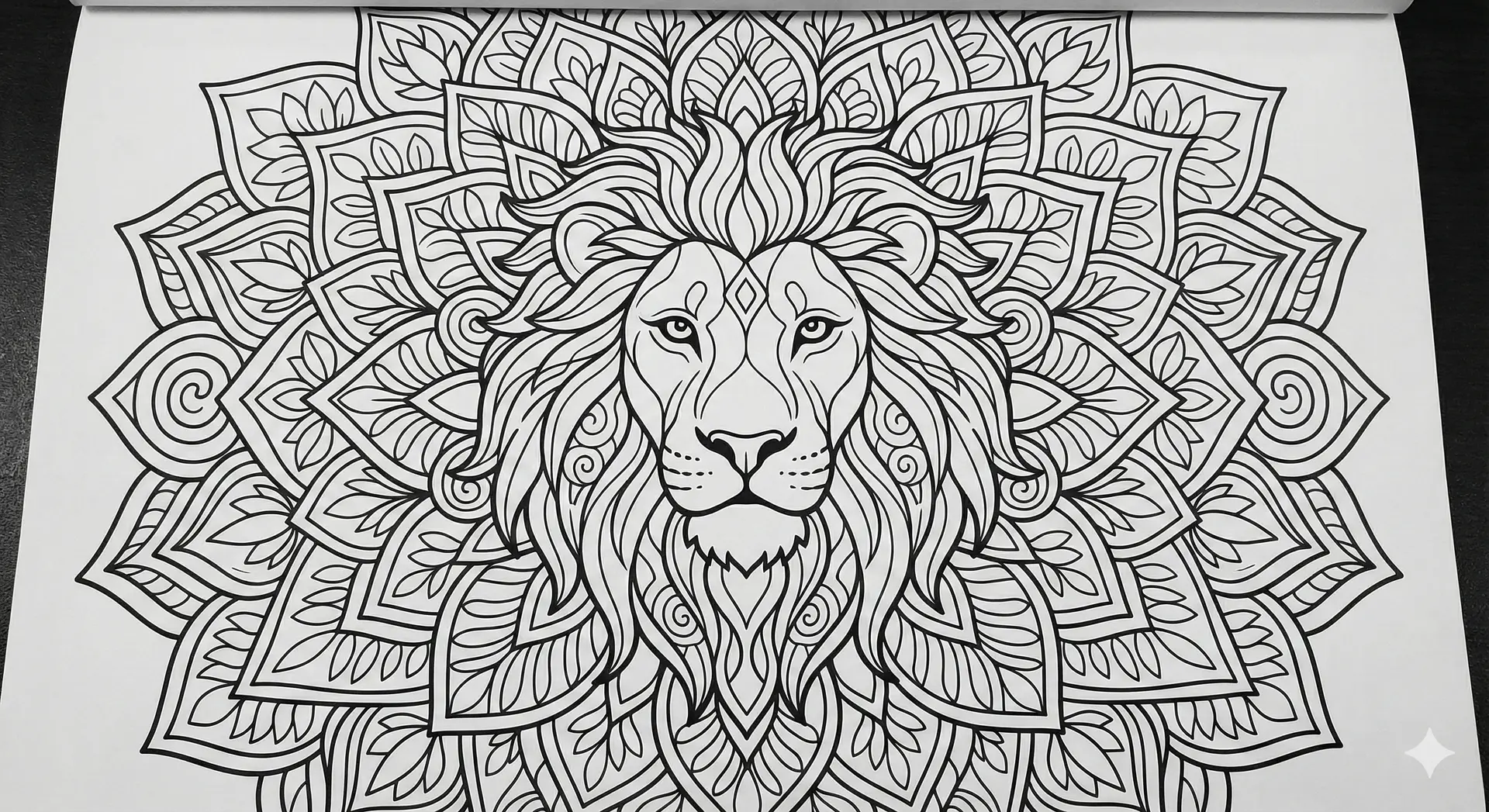 - Prompt 靈感: A complex black and white coloring page line art, a detailed mandala pattern featuring a lion's face in the center, thick outlines, no shading.