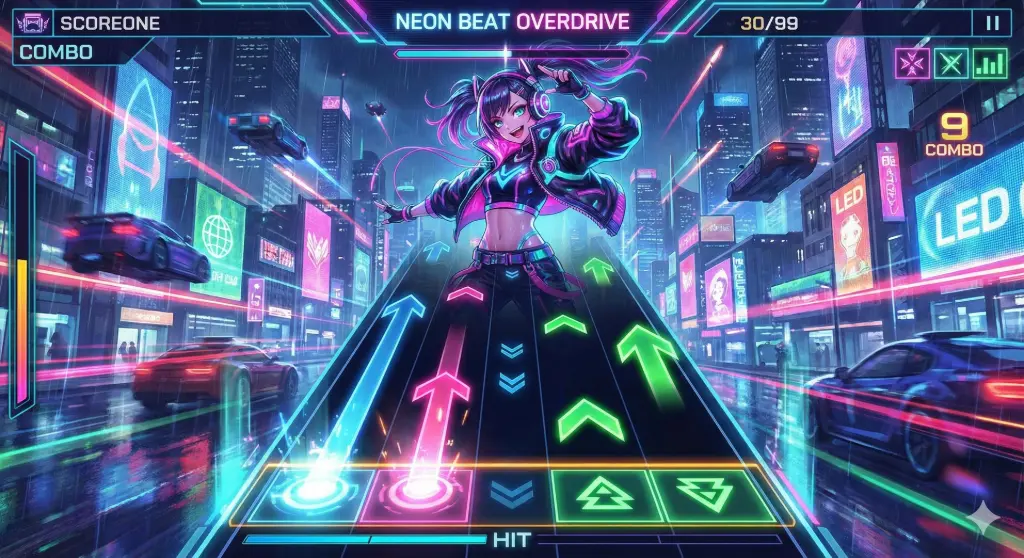 - Prompt 靈感: A vibrant rhythm game screenshot, futuristic UI, neon arrows flying, high energy anime character dancing, cyber city background.