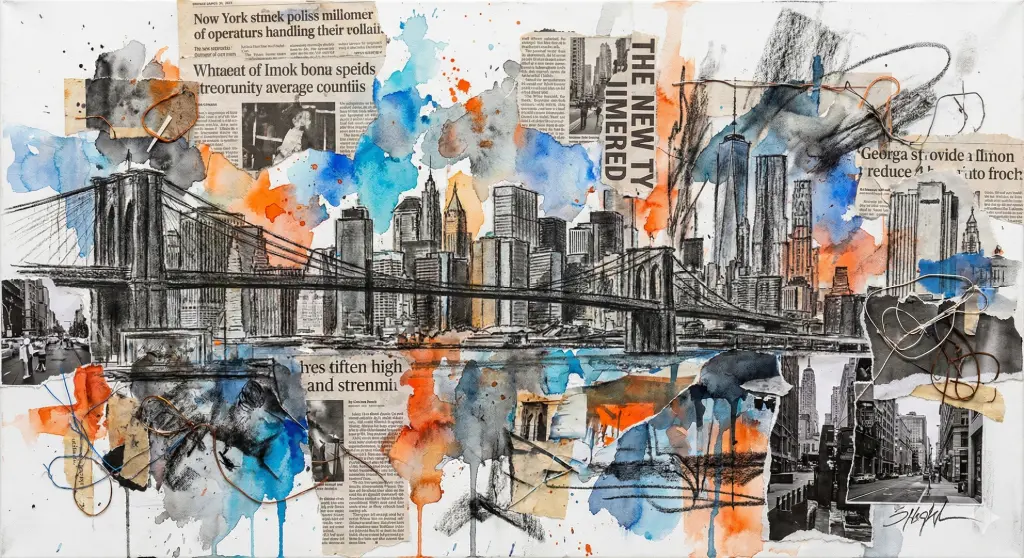 - Prompt 靈感: Mixed media art collage of a city skyline, combining torn newspaper clippings, watercolor splashes, charcoal sketches, and photographs, chaotic and artistic.