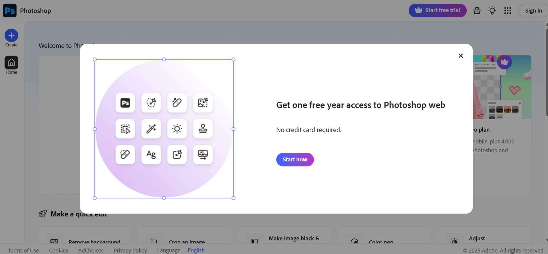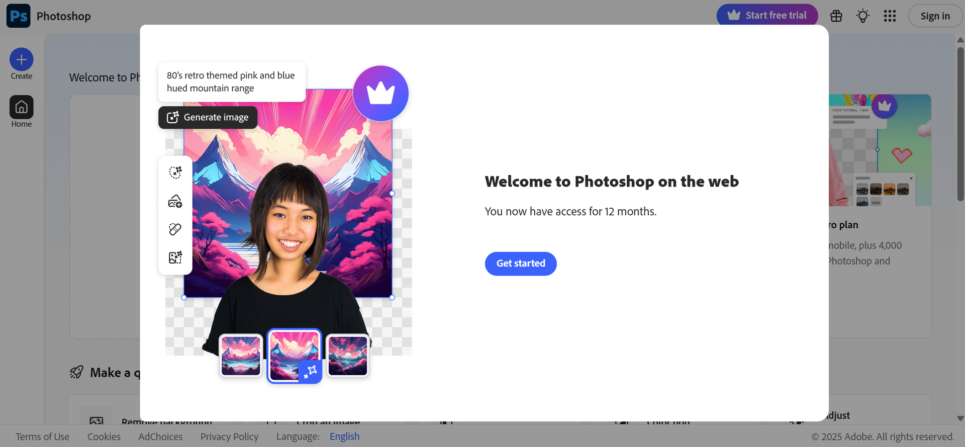 沒錯,就是那個原本一個月要好幾百塊的正版 Photoshop,現在只要三個步驟,2025 年底前通通免費用,而且還是完整功能(包含 Generative Fill、Remove Distractions 等最新 AI 工具),完全不是閹割版!